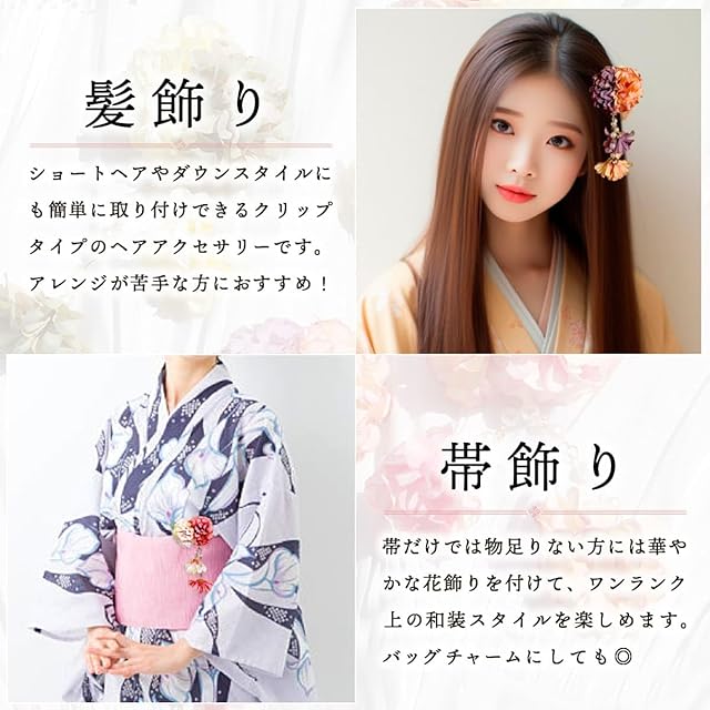 【ヘアクリップタイプ】和装のお団子ヘア、まとめ髪に。また、クリップタイプですので、ショートヘアの方にもご使用いただけます。簡単に髪に留めるだけで、和装スタイルにワンポイントのお花が華やかさを添えます。