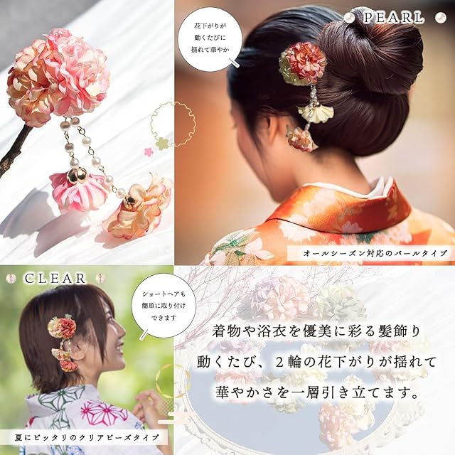 【花下がりが可愛い髪飾り】着物や浴衣のお色に併せたり、お好きな色で楽しんだり、髪飾りを付けてみませんか?小ぶりでさりげなく、花下がりが優しく揺れて上品な可愛さがあります。花下がり部分がパールタイプとクリアビーズタイプがございます。