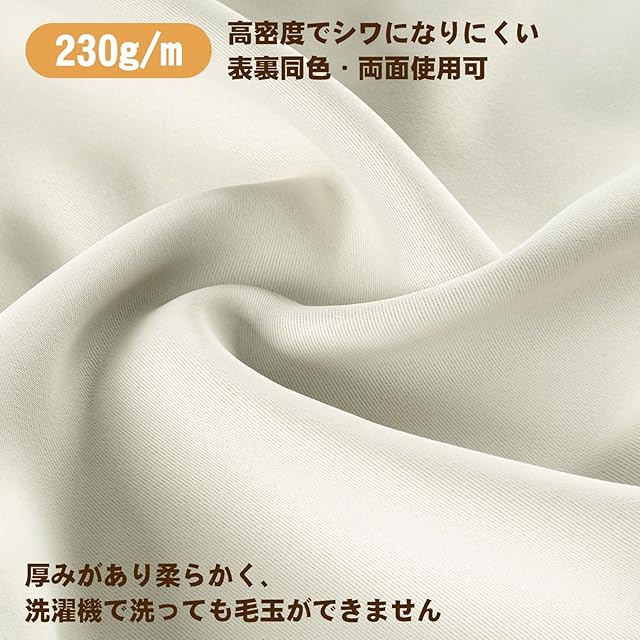 【柔らかい高密度生地・表裏同色】高密度と柔らかい生地で使用、表裏同色両面を使用できます。厚みがあり、柔らかく、洗濯機で洗っても毛玉ができません。お手入れしやすいのでいつも清潔に使用できます。カーテンの重みで洗濯ジワも伸ばすことができので、形態安定としてはとても効果が期待できます。