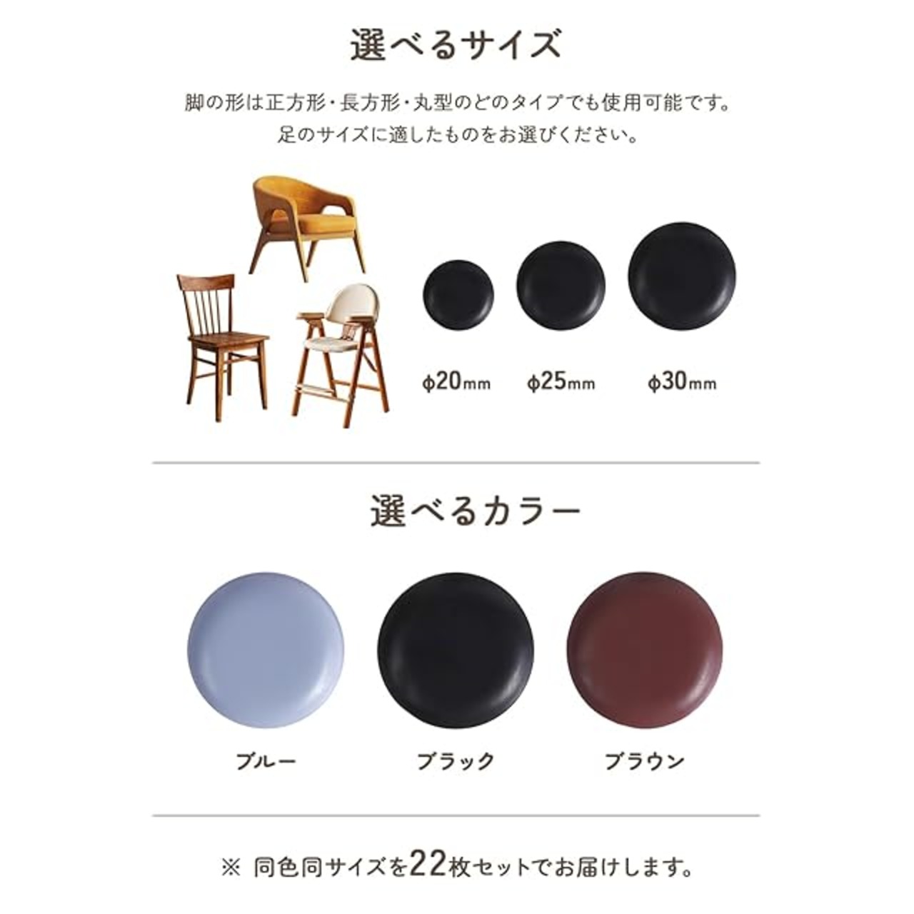 セット内容、家具スライダー 22枚入り(同色・同サイズ)。選べるサイズ:20mm/25mm/30mm。選べるカラー:ブラック/ブルー/ブラウン