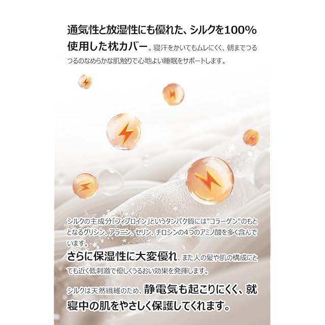 【抗菌性・静電気防止】シルク枕カバーは綿より約1.5倍の保湿性と吸湿性があるから、天然の保湿成分セリシンで覆われており、静電気が発生しにくく、保湿性や通気性、保温性に優れており、アレルギーの原因ともなるホコリを寄せ付けにくく抗菌性にも優れているので、衛生的で安心してお使いいただけます。