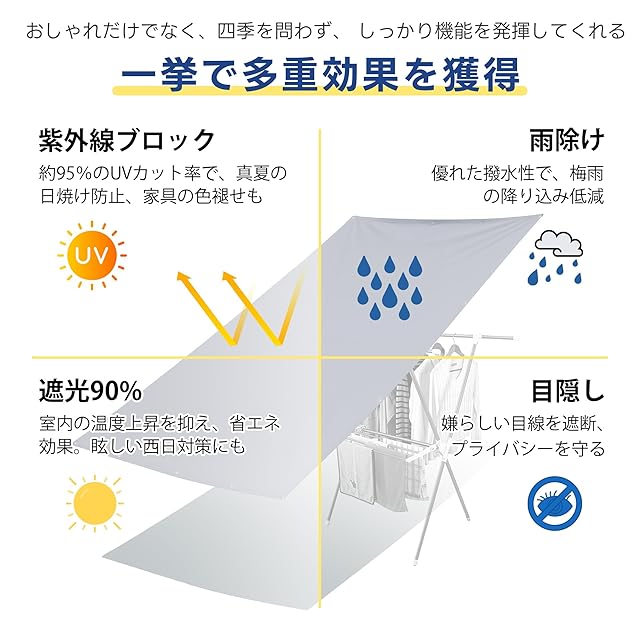 【撥水加工 日除けシェード】DANOFY撥水シェードは、高品質420Dポリエステル素材を使用し、表面に2重PUコーティングを施し、優れた撥水性を誇るサンシェードです。PUコーティングは水が繊維に浸透するのを防ぎ、蓮の葉のように雨水や飛沫を効果的にはじきます。ベランダでこの日よけシェードの設置により、突然な雨に遭っても、雨避けになりベランダでの床や内容物が濡れることはなく、慌てずにノンビリとベランダのレジャータイムを楽しめます。雨がたまらないように、垂直角度を40度以上に斜めで日除けシートの設置をお勧めします。