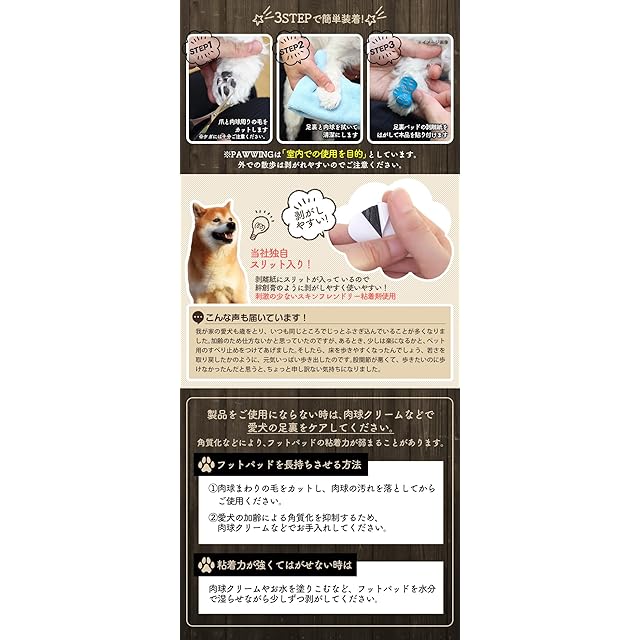 【知っていましたか?犬にとって、フローリングは天敵なんです!】フローリングは、滑ってしまい足のふんばりが利かず、思い通りに歩けないこともあります。腰やヒザ、股関節を痛めて膝蓋骨脱臼や椎間板ヘルニア一因ともなりかねません!飼い主としては、可愛い我が子が、苦労しているのを見るのは心が痛みます…。 【専用シューズやカーペットもあるけれど…】フローリングの滑り止め対策として、ペット用シューズやカーペット、専用フローリングなどの選択肢はありますが、専用シューズや靴下を使っても…ペットが嫌がって脱いでしまう。暴れてしまって、履かせるだけでひと苦労!カーペットを敷いても…カーペットは愛犬が遊んで、ぐちゃぐちゃにしてしまう。。。思い切って専用のフローリングにすると…大切なペットのためとはいえ、全室ペット専用フローリングを敷こうとすると費用が高い!!などなど、悩みも多いですよね。そんなお困りの飼い主さんにオススメなのが、ワンちゃんの肉球に貼るだけOKの「PAW WING」なんです!