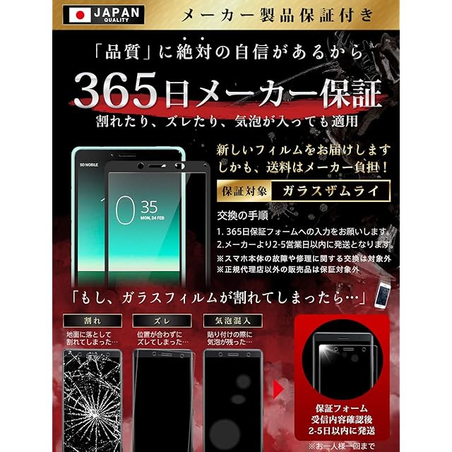商品名:ガラスザムライ Xperia 10 Ⅱ 用 ガラスフィルム SOV43 用 SO-41A 用 全面保護 硬度 10H 強化ガラス 保護フィルム 米軍MIL規格 263-3d-bk