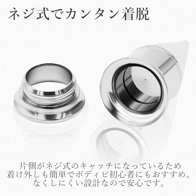 【ネジ式でカンタン着脱】片側がネジ式のキャッチになっているため着け外しも簡単でボディピ初心者にもおすすめ。なくしにくい設計なので安心です。