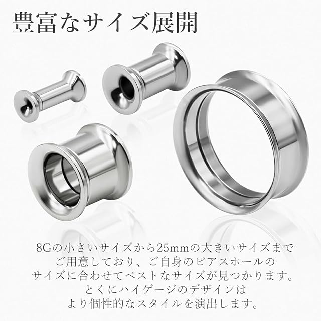 【豊富なサイズ展開】サイズ16Gの小さいサイズから40mmの大きいサイズまでご用意しており、ご自身のピアスホールのサイズに合わせてベストながサイズが見つかります。とくにハイゲージのデザインはより個性的なスタイルを演出します。