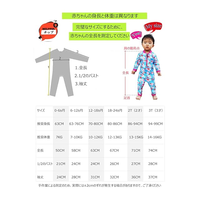 サイズと身長の比較:0-6ヵ月(60CM)、6-12ヵ月(70)、12-18ヵ月(80CM)、18-24ヵ月(90CM)、2歳(80-90CM)、3歳(100CM)