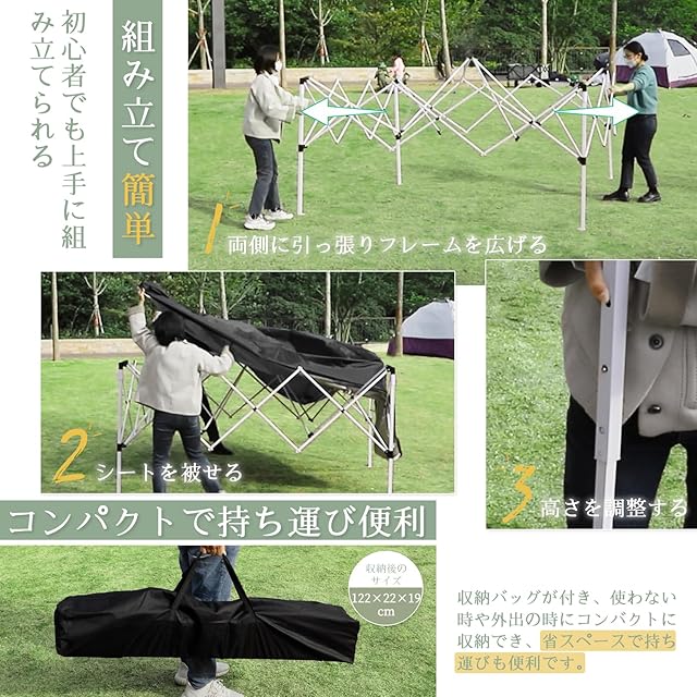 【組み立て簡単&持ち運び&収納便利】➊ワンタッチタープのフレームを開けてシートを被せて固定すればいいです。動画には詳細な組立説明があります。初心者でも一人でも短時間で設営できます。➋この防水タープは収納バッグが付き、使わない時や外出の時にコンバクトに収納でき、車内や室内に収納しても空間を取りなくて、持ち運びも便利です。