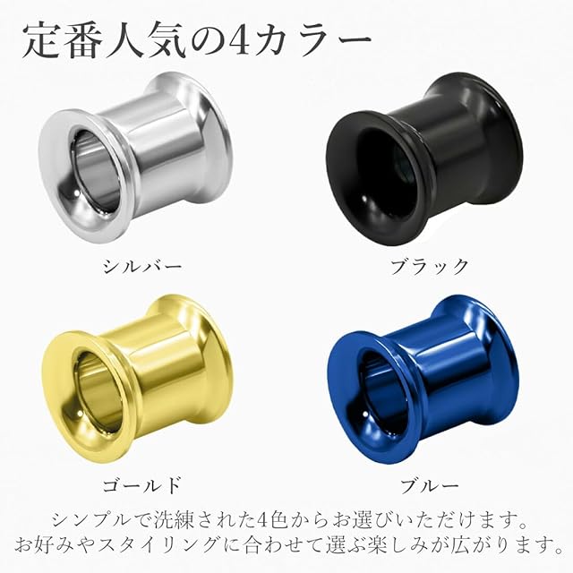 【定番人気の4カラー】シンプルで洗練されたシルバー、ゴールド(金)、ブラック(黒)ブルー(青)の4色からお選びいただけます。お好みやスタイリングに合わせて選ぶ楽しみが広がります。