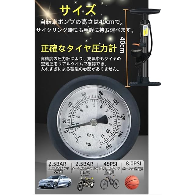 【幅広い用途】バスケットボール、ラグビー、フットボールなどのスポーツボールを膨らませるエアニードルを装備しています。マウンテンバイクやロードバイク、電動自転車、通勤用バイク、スイミングリング、ベビーカー、車椅子に特に適しています。