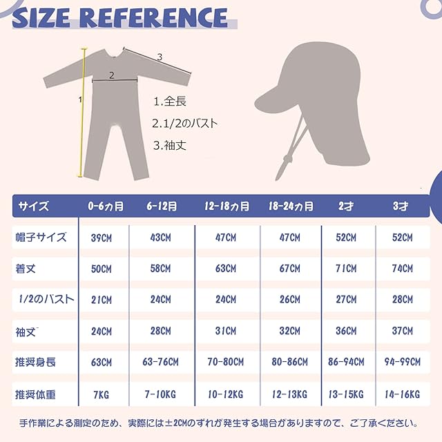 サイズと身長の比較:0-6ヵ月(60CM)、6-12ヵ月(70CM)、12-18ヵ月(80CM)、18-24ヵ月(90CM)、2歳(90-95CM)、3歳(100CM)