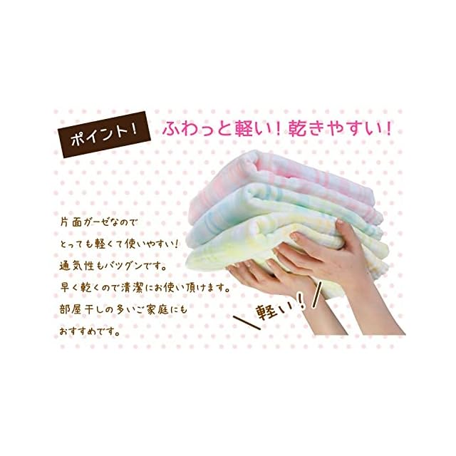 片面ガーゼなのでとっても軽くて使いやすく通気性もばつぐんです。一般的なタオルよりも乾きやすいのでより清潔にお使いいただけます。部屋干しの多いご家庭にもおすすめです。