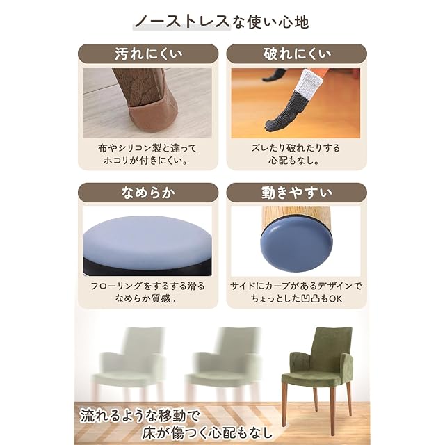 キズ&騒音防止:床の傷防止、引きずり音の軽減、階下への音も安心。