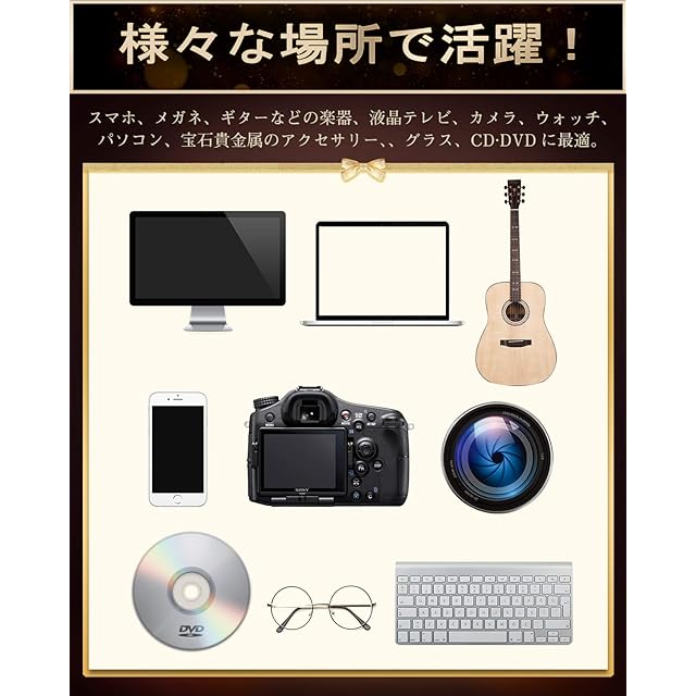 【適用範囲】 さまざまな楽器(例えばバイオリン、チェロ、ギター、ピアノ、サックス、フルート、トーンピアノ、琵琶、尺八、三味線、二胡など)の表面清潔に適する弦楽器クロスです。また、眼鏡クリーナークロス、スマホ/タブレット/パソコンなど液晶画面拭きクロス、カメラレンズ、CD、DVD、ジュエリー、腕時計などの清潔にもご使用頂けます。
