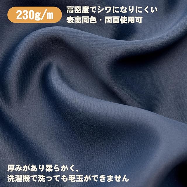 【柔らかい高密度生地・表裏同色】高密度と柔らかい生地で使用、表裏同色両面を使用できます。厚みがあり、柔らかく、洗濯機で洗っても毛玉ができません。お手入れしやすいのでいつも清潔に使用できます。カーテンの重みで洗濯ジワも伸ばすことができので、形態安定としてはとても効果が期待できます。
