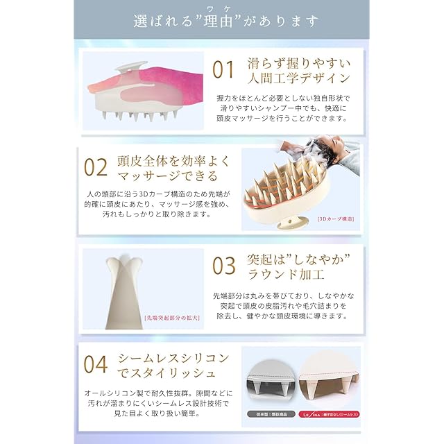 ✅【人間工学に基づく設計】滑りやすいシャンプー中でも握力いらずで握りやすい「形」。内部は頭皮に沿う「3Dカーブ」形状でピッタリフィット。頭皮を傷つけない硬さを重視した突起で気持ち良いマッサージ感を得れます。