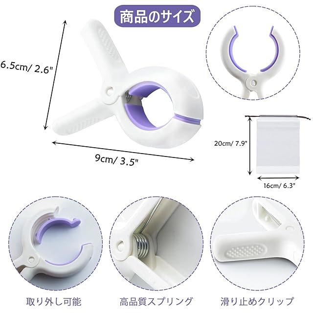 【強力洗濯バサミ】クリップ開口部:5CM、長さ9.5CM、幅6.5CM。(サイズが多少の誤差がある可能性もあり 、予めご了承くださいませ。)高品質の厚みのあるPP素材でできており、内部にTPR滑り止めパッドがあり、耐用年数が長く、壊れにくく、ピンチマークがなく、衣服を傷つけません。