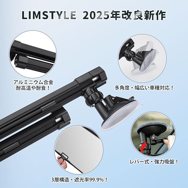 4.【ワンタッチ設置&常時取付型】主に3ステップ設置手順:①吸盤位置決め → ②ポール伸縮調整 → ③フックに掛けるだけ工具不要のカンタン取り付け! 日本語取説付属、初心者向け。【サンシェードを収納する時のコツ】①手で軽く巻き上げ→ ②手を放して収納パイプに自動吸引させます→ ③途中で止まる場合は、一度広げてシワを伸ばすとスムーズに動作します。