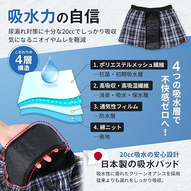 【まるで普通のトランクス】 目立たない自然な見た目で普段使いに。吸水機能付きとは思えない自然な形状。前から見ても横から見ても、普通のトランクスと変わらない見た目です。スーツや普段着にも響きにくく、外出や通勤でも気兼ねなく着用が可能です。吸水パンツに見られたくない、という方に安心のデザインです。 【しっかり吸収、漏れを防ぐ安心設計】 吸水量20cc・漏れ対策・日本製吸水パッド採用。尿漏れ対策に十分な吸水力で、20ccの水分をしっかりキャッチ。急な“ちょい漏れ”でも安心。吸水性に優れた日本製パッド「クリーンオアシス」が、漏れを防ぎ、逆戻りも抑えます。長時間でも安心できる設計で、外出時や夜間にも最適。吸水パッドは下着に内蔵されており、装着の手間もありません。 【快適な履き心地を実現する4層構造】 ポリエステルメッシュ・高吸湿繊維・通気フィルム・綿ニットの4層設計で、多機能性を実現しました!抗菌・消臭でニオイを抑え、通気層がムレを逃していつでもサラサラ。防水層が衣類への染み出しをしっかりブロック。薄型なので、パットがごわつかず快適な履き心地です。 【ムレにくく、年中快適な通気性設計】 ブリーフやボクサータイプと違い、トランクス形状ならではの開放感ある履き心地。後ろ部分は通気性に優れたメッシュ素材を採用し、長時間の着用も蒸れにくい仕様です。 本体は綿100%の生地で肌当たりがやさしく、汗をかいても貼りつきづらく、春夏はもちろん、冬場の重ね履きにも対応するオールシーズンご活用頂けます。 【繰り返し洗えて経済的】 お洗濯をしても、吸水機能が落ちません。洗濯機で洗えるから、毎日使えてとても経済的です。ネット使用で簡単に洗え、繰り返しの洗濯にも耐えられる設計になっています。 紙パンツのように使い捨てる必要がないので、普通の下着と同じようにご利用頂けます。さらに、サイズ交換があるから初めての方でも安心して購入頂けます。