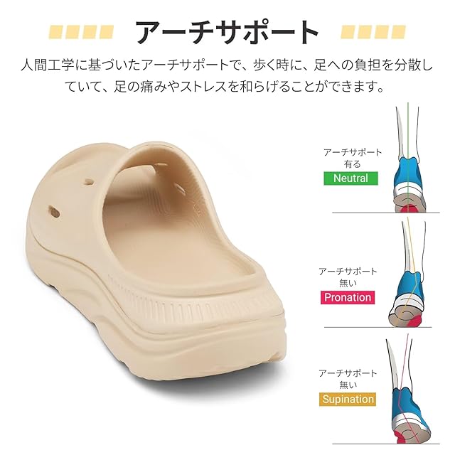 ■前後の湾曲により、自然な歩行をサポートしてくれます。そのため、運動後はもちろん、おうち時間やオフィス・日常と、さまざまなところで活躍します。内履き、外履き、季節関係なく使用することができます