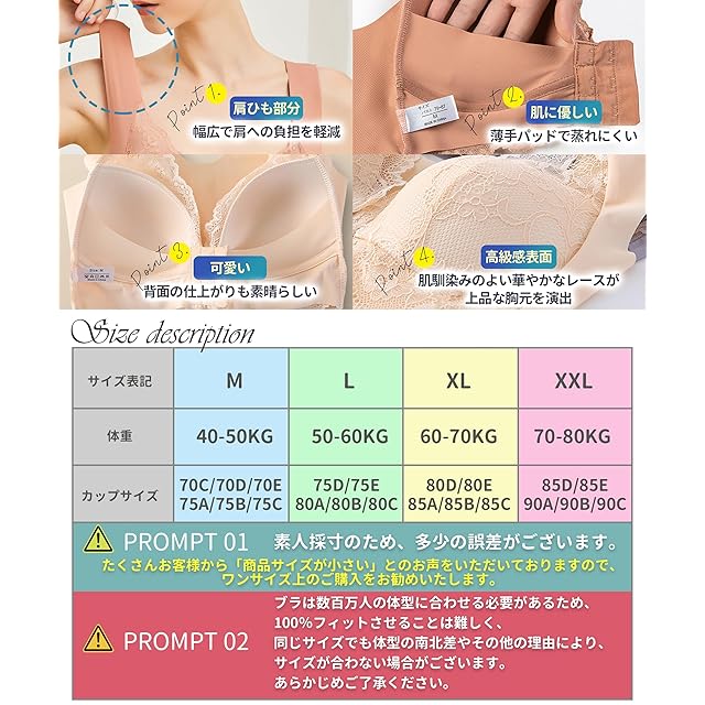 【24時間バストケア】ブラジャーはシンプルなデザインながらも繊細なレースをあしらい、大人可愛い雰囲気に。肌馴染みのよい華やかなレースが上品な胸元を演出ブラジャーです。家で着て、出勤して、运动して寝ることができます。ヨガ、ジム、スポーツ、ダンス、運動、内着あるいは外着、妊娠と哺乳期間睡眠時幅広くお使いいただけ前ホック ブラジャー。