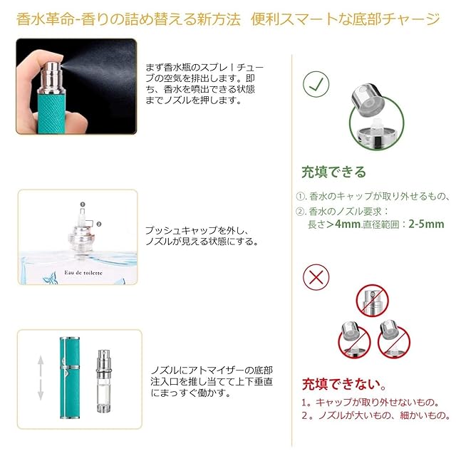 E.使用対象:1、香水キャップが取り外せるもの 2、香水のノズルの直径が2-5mm範囲内であるまの、長さの範囲が4mm以上は直接に使用できます。