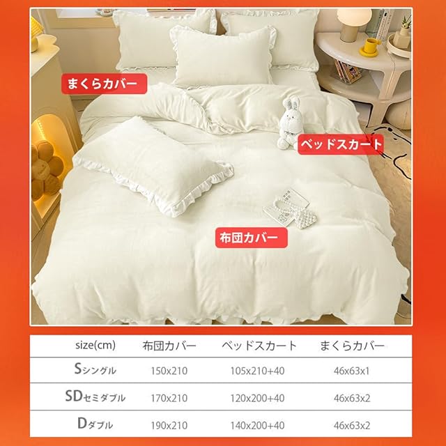 【サイズ展開】掛け布団カバーには8箇所のズレ防止紐が付いて、しっかり固定できます。ベッドスカートがゴム付いて、脱着が簡単です。3点セットシングルサイズ:布団カバー:150cm*210cm ベッドスカート:100cm*(200+45マチ)cm まくらカバー:43cm*63cm*1点 /4点セットセミダブル:布団カバー:170cm*210cm ベッドスカート:120cm*(200+45マチ)cm まくらカバー:43cm*63cm*2点/4点セットダブル:布団カバー:190cm*210cm ベッドスカート:140cm*(200+45マチ)cm まくらカバー:43cm*63cm*2点 真空で出荷し、商品を受け取ってから数日置くとさらにふわふわになります。