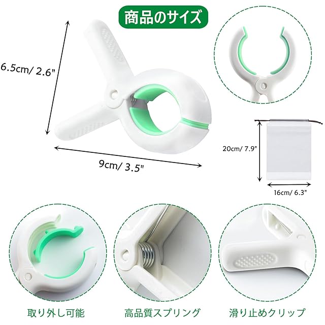 【強力洗濯バサミ】クリップ開口部:5CM、長さ9.5CM、幅6.5CM。(サイズが多少の誤差がある可能性もあり 、予めご了承くださいませ。)高品質の厚みのあるPP素材でできており、内部にTPR滑り止めパッドがあり、耐用年数が長く、壊れにくく、ピンチマークがなく、衣服を傷つけません。