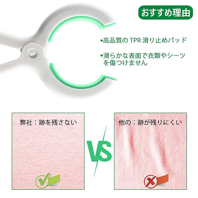 【強力クリップ】クリップの内側には、シリコンの滑り止めマットが取り付けられており、滑り止めだけでなく、服を挟んでも跡が残らない。大きな開口部とスプリングの設計により、強力なクランプ力が得られ、強風に吹かれたり、激しく振られたりしても、乾燥する衣類が脱落しません。