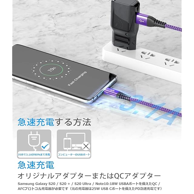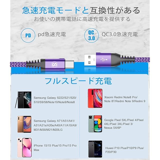 商品名:USB Type C ケーブル【2M/2本セット】Sweguard USB-C & USB-A 3.1A USB C ケーブル【QC3.0対応急速充電】タイプc 充電 iPhone17 16/iPhone 15 Pro MAX, iPad Pro,Samsung Galaxy S25/S24/S23/S22/S21/S20/S10,Pixel,usb type-c機器と互換性があり (紫)