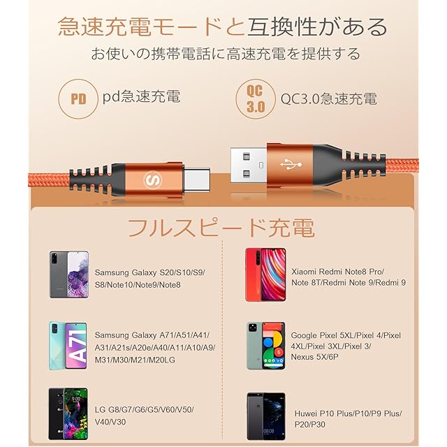 商品名:USB Type C ケーブル【3M/2本セット】Sweguard USB-C & USB-A 3.1A USB C ケーブル【QC3.0対応急速充電】タイプc 充電 iPhone17 16/iPhone 15 Pro MAX, iPad Pro,Samsung Galaxy S25/S24/S23/S22/S21/S20/S10,Pixel,usb type-c機器と互換性があり (オレンジ)