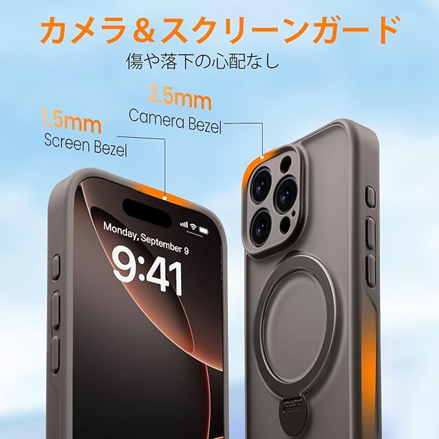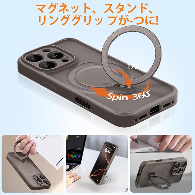商品名:【カチッ!2024 新開発・安定性】Gtsoho iPhone 16 Pro Max 用 ケース ゼンマイ式スタンド縦横両対応 リング マグネット搭載 MagSafe 対応 ワイヤレス充電対応 米軍 MIL 規格耐衝撃 指紋防止 黄変防止 マグセーフ対応 6.9 インチ iPhone16 Pro Max 用ケース「回転ブラケット」グレー