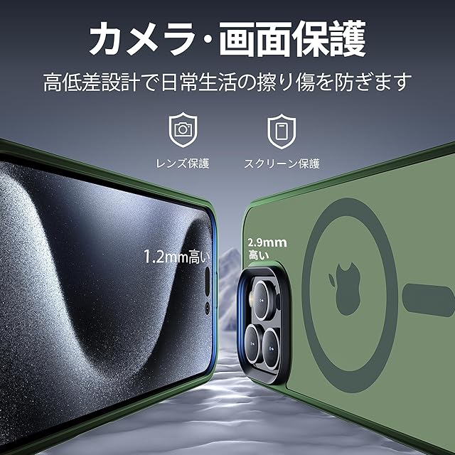 いくら気をつけていても落とす時がある!でも大丈夫!2Mの高さから26回以上落としても本体は綺麗に無傷!背面「カメラエアバッグ」耐衝撃技術も備えています。耐震性の高いTPUバンパーと頑丈なPC背面と組み合わせた二重構造で、非常に高い耐衝撃性を誇り、アイフォン16 Pro Max を全方位からしっかりと守ります。