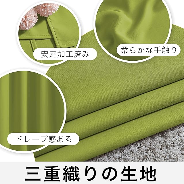 【縫製/付属品】1.5倍ヒダ・ 2ッ山 ・形態安定加工。遮光カーテン2枚入り、共布タッセル2枚付き、アジャスターフック14本付き(予備フック2本)、高さ6cmまで、14段階調節可能です。100%ポリエステルより、耐久性がよい。厚地の生地が絹のような滑らか、輝いているさま光沢があります。