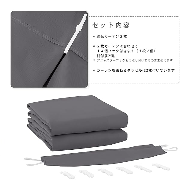 【縫製/付属品】1.5倍ヒダ・ 2ッ山 ・形態安定加工。遮光カーテン2枚入り、共布タッセル2枚付き、アジャスターフック14本付き(予備フック2本)、高さ6cmまで、14段階調節可能です。100%ポリエステルより、耐久性がよい。厚地の生地が絹のような滑らか、輝いているさま光沢があります。