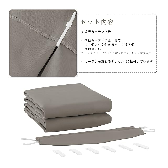 【縫製/付属品】1.5倍ヒダ・ 2ッ山 ・形態安定加工。遮光カーテン2枚入り、共布タッセル2枚付き、アジャスターフック14本付き、高さ6cmまで調節可能です。100%ポリエステルより、耐久性がよい。厚地の生地が絹のような滑らか、輝いているさま光沢があります。