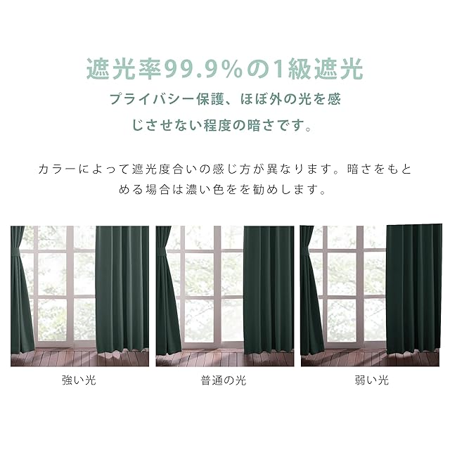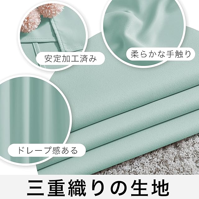 【縫製/付属品】1.5倍ヒダ・ 2ッ山 ・形態安定加工。遮光カーテン2枚入り、共布タッセル2枚付き、アジャスターフック14本付き、高さ6cmまで調節可能です。100%ポリエステルより、耐久性がよい。厚地の生地が絹のような滑らか、輝いているさま光沢があります。
