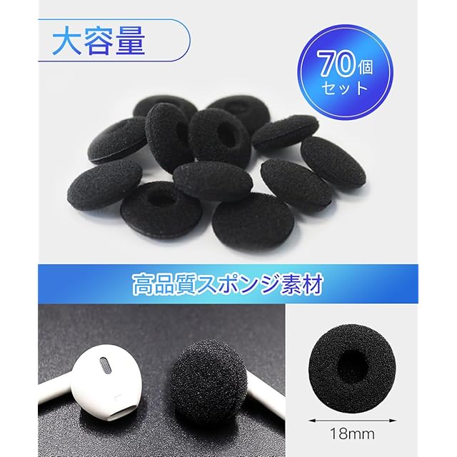 【セット内容】イヤークッション70個セット、サイズ:18mm、カラー:ブラック。
