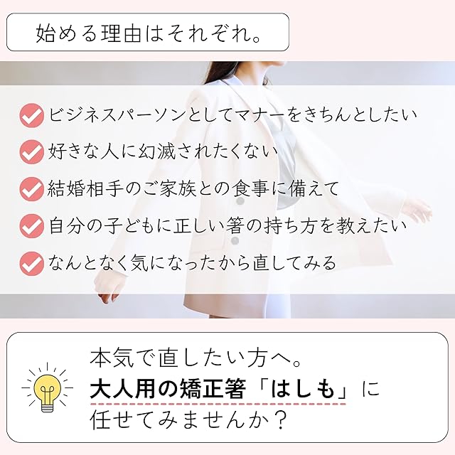 仕様 品名:はしも(大人用矯正箸、三点支持箸) 材質:天然木 塗装:うるし塗装 産地:日本 サイズ:右利き用 23.5cm, 23cm, 20.5cm, 18cm / 左利き用 23cm, 20.5cm, 18cm 内容:箸1膳 お手入れ:手洗い 注意事項:右利きと左利きの箸があります。適切なものを選んでください。 「はしも」矯正箸は、美しい箸使いを身につけたい大人の女性にぴったりのアイテムです。日本製で品質にこだわり、使い勝手と美しさを兼ね備えたこの箸は、毎日の食卓をより豊かなものにしてくれるでしょう。