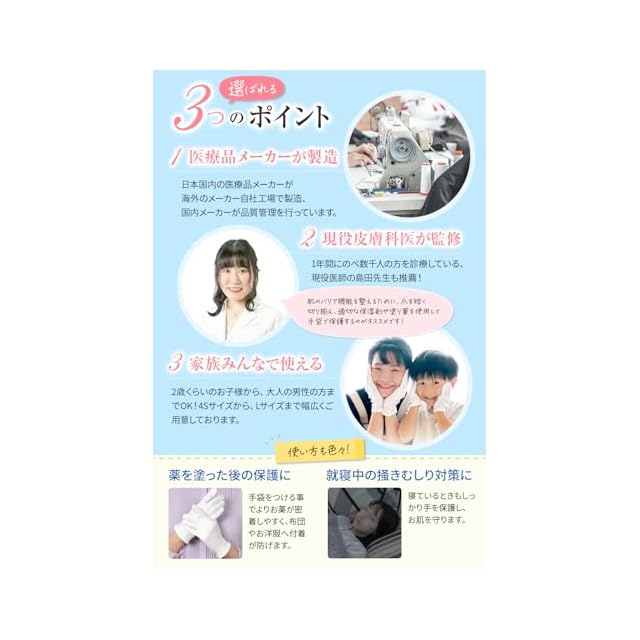 【皮膚科医島田先生もおすすめ!】皮膚科のプロも認める、子供たちから大人まで家族の肌を守るコットン手袋。キッズのデリケートな肌にも。皮膚科医の島田先生もおすすめする、コットン素材のめんてぶくろ。コットン手袋は、特にキッズ、児童に最適で、市場ではなかな見かけない、SSサイズがございます。こども用や低学年、高学年、と幅広い年齢層に対応したサイズが揃っています。子供たちのデリケートな肌を外部の刺激から守り、安心して使用できる品質を提供します。幼稚園児(幼児用)は別ページで小さいものを販売中。