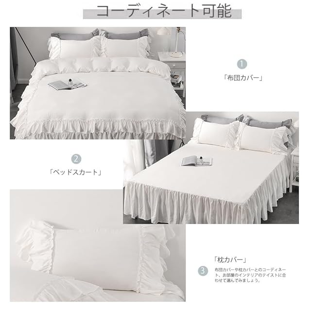 商品名:布団カバー 3点セット 4点セット フリル付き布団カバー 寝具カバー 洋式・和式兼用 ベッドカバー 掛け布団カバー ボックスシーツ 枕カバー シーツカバー 肌に優しい ピーチスキン加工 北欧風 四季通用