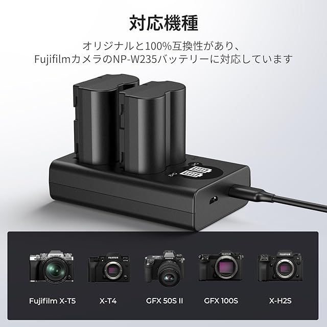 【互換性】Fujifilm対応カメラのNP-W235バッテリーに対応しています。富士フィルム対応のX-T5, X-T4, GFX 100S, X-H2S, GFX 50S II, VG-XT4等の機種のNP W235バッテリーに対応しています。