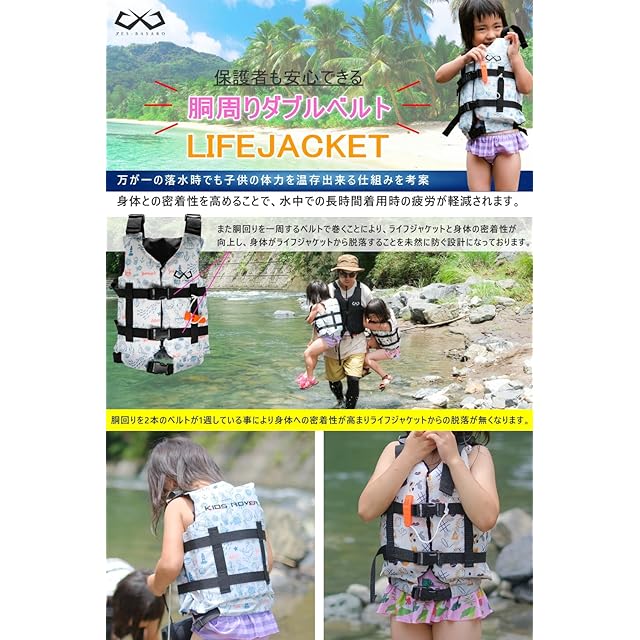 ライフジャケットメーカーのBASAROが作った子供用特化型レジャーベストです。主な使用用途としては、シュノーケリング 釣り 川遊び 海水浴 サップ 等々での使用を想定し設計しております。メーカー工場出荷時の初期浮力は3.5kgのライフジャケットで、着用想定重量は40kg未満としております。男の子(メンズ)女の子(レディース)共に着用できるデザインになっております。本製品は救命胴衣としての着用は想定しておりませんので、着用者の保護者様で必ず安全管理を行うようお願い致します。