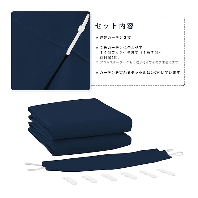 【縫製/付属品】1.5倍ヒダ・ 2ッ山 ・形態安定加工。遮光カーテン2枚入り、共布タッセル2枚付き、アジャスターフック14本付き(予備フック2本)、高さ6cmまで、14段階調節可能です。100%ポリエステルより、耐久性がよい。厚地の生地が絹のような滑らか、輝いているさま光沢があります。