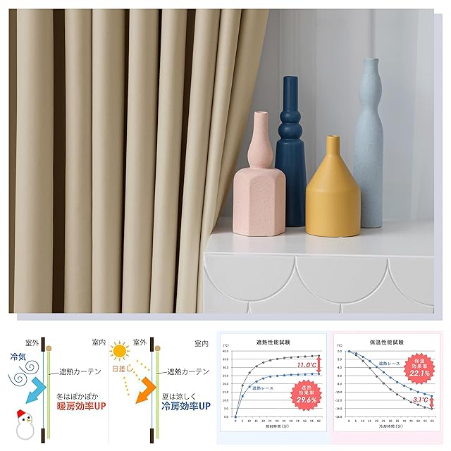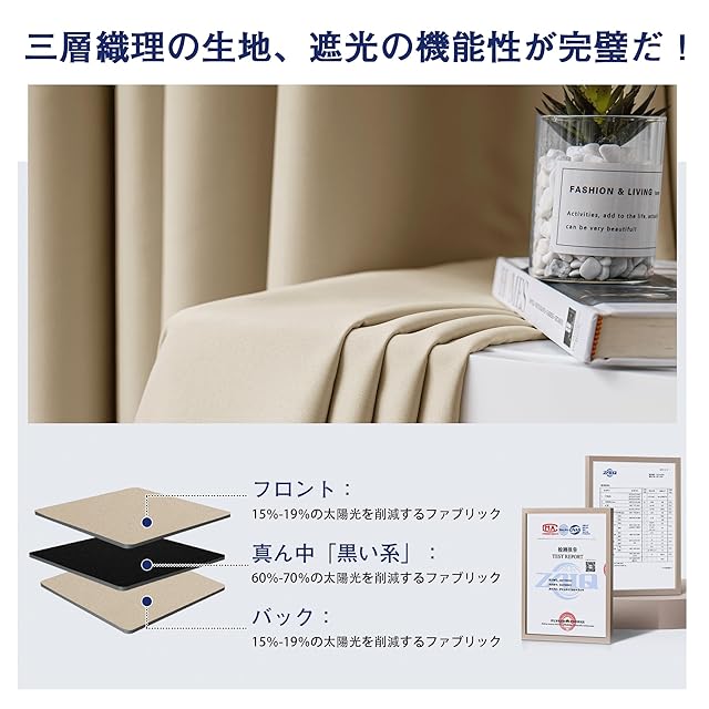 【縫製/付属品】1.5倍ヒダ・ 2ッ山 ・形態安定加工。遮光カーテン1枚入り、共布タッセル1枚付き、アジャスターフック10本付き(予備フック2本)、高さ6cmまで、14段階調節可能です。100%ポリエステルより、耐久性がよい。厚地の生地が絹のような滑らかな光沢があります。