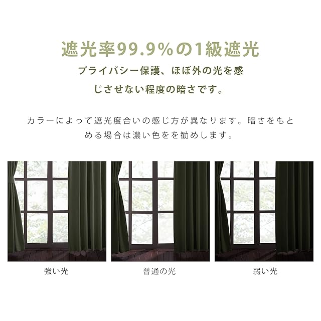 お取扱い上のご注意の点 ●入数:2枚遮光カーテン+フック14個(予備2個)+共布タッセル2枚 ●機能:三重織りのテクノロジーを利用して、遮光率85%~99.9%(暗い色のカーテンの方が遮光効果より良いです)。窓外からの紫外線や強い日差しがよく遮られます。 ●洗濯OK:洗濯の際はフックを外して洗濯機に入れて丸洗うことができます。 ●組成:ポリエステル100% ●カーテン、スクリーンなどの端部分から光が漏れますのでご了承ください。 ●ご注文確定の前にもう一度サイズと色のご確認をお願い致します。 ●各商品写真に関してですが、お客様がご覧のモニターやお部屋の環境により、 イメージと異なる場合がございますので、予めご了承ください。