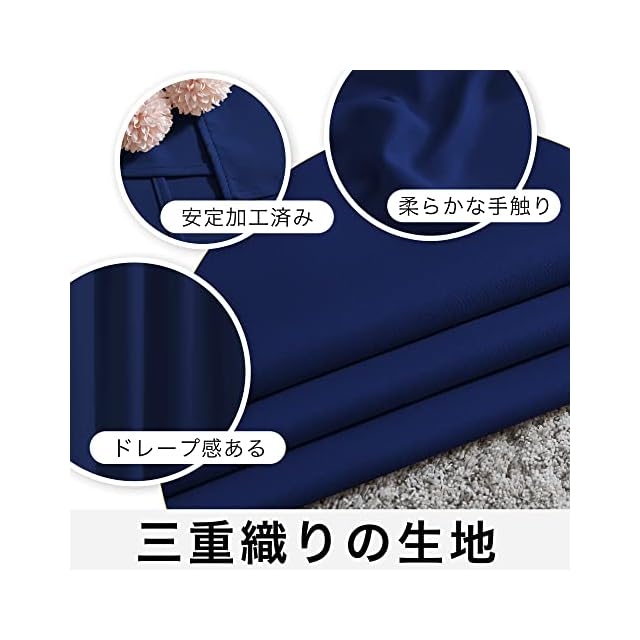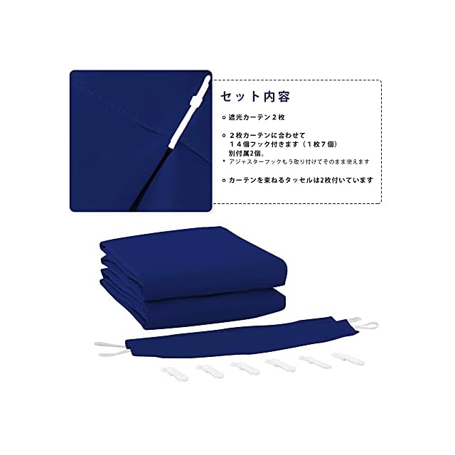 【縫製/付属品】1.5倍ヒダ・ 2ッ山 ・形態安定加工。遮光カーテン2枚入り、共布タッセル2枚付き、アジャスターフック14本付き(予備フック2本)、高さ6cmまで、14段階調節可能です。100%ポリエステルより、耐久性がよい。厚地の生地が絹のような滑らか、輝いているさま光沢があります。