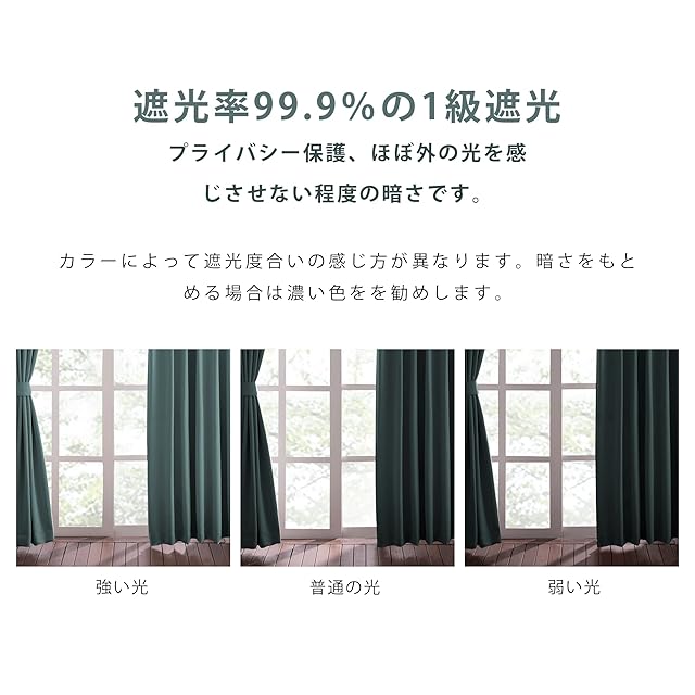 【縫製/付属品】1.5倍ヒダ・ 2ッ山 ・形態安定加工。遮光カーテン2枚入り、共布タッセル2枚付き、アジャスターフック14本付き、高さ6cmまで調節可能です。100%ポリエステルより、耐久性がよい。厚地の生地が絹のような滑らか、輝いているさま光沢があります。