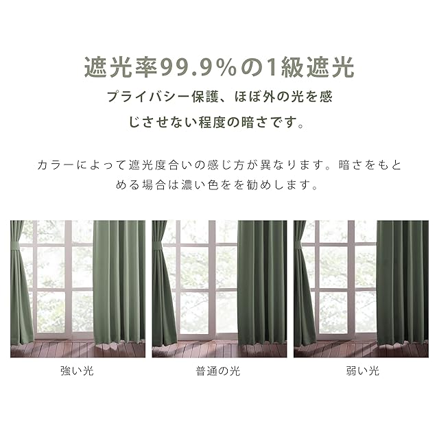【縫製/付属品】1.5倍ヒダ・ 2ッ山 ・形態安定加工。遮光カーテン2枚入り、共布タッセル2枚付き、アジャスターフック14本付き、高さ6cmまで調節可能です。100%ポリエステルより、耐久性がよい。厚地の生地が絹のような滑らか、輝いているさま光沢があります。