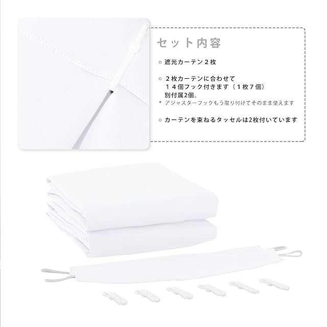 【縫製/付属品】1.5倍ヒダ・ 2ッ山 ・形態安定加工。遮光カーテン2枚入り、共布タッセル2枚付き、アジャスターフック14本付き、高さ6cmまで調節可能です。100%ポリエステルより、耐久性がよい。厚地の生地が絹のような滑らか、輝いているさま光沢があります。